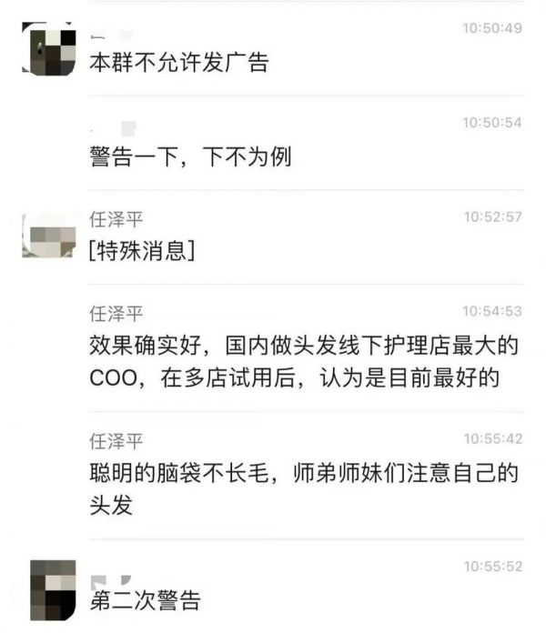 另外,网络还流传着一张疑似“任泽平在私域群内打广告被警告”的微信截图。有网友笑称,“经济学家任泽平也不容易,不顾群主踢出警告,兢兢业业在群里推销生发水…… ”