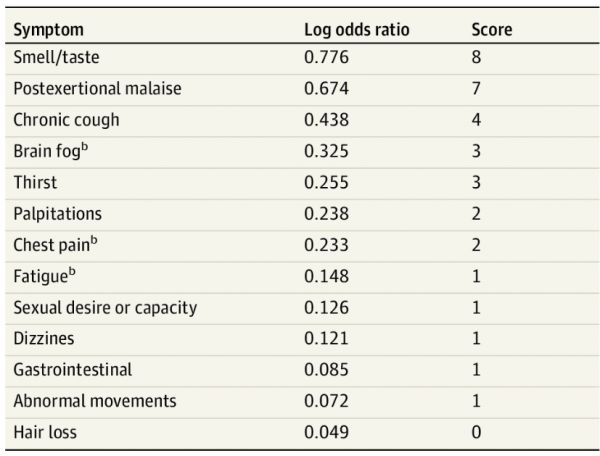 研究人员为每一种症状指定了分值。例如,嗅觉或味觉的丧失,定为8分,因为该症状在没有感染过新冠的人群中非常少见,而其他疾病也常见的头晕和疲劳仅占1分。