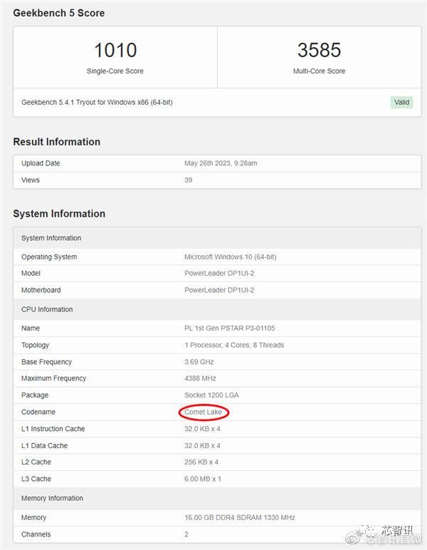 根据最新的GeekBench跑分库显示,PSTAR P3-01105其代号显示为Comet Lake处理器,采用LGA 1200插槽,以14nm工艺制造,基础频率为3.7 GHz,睿频为4.4 GHz,L3缓存为6MB,核显为UHD 630,频率为1.1 GHz,TDP为65W。