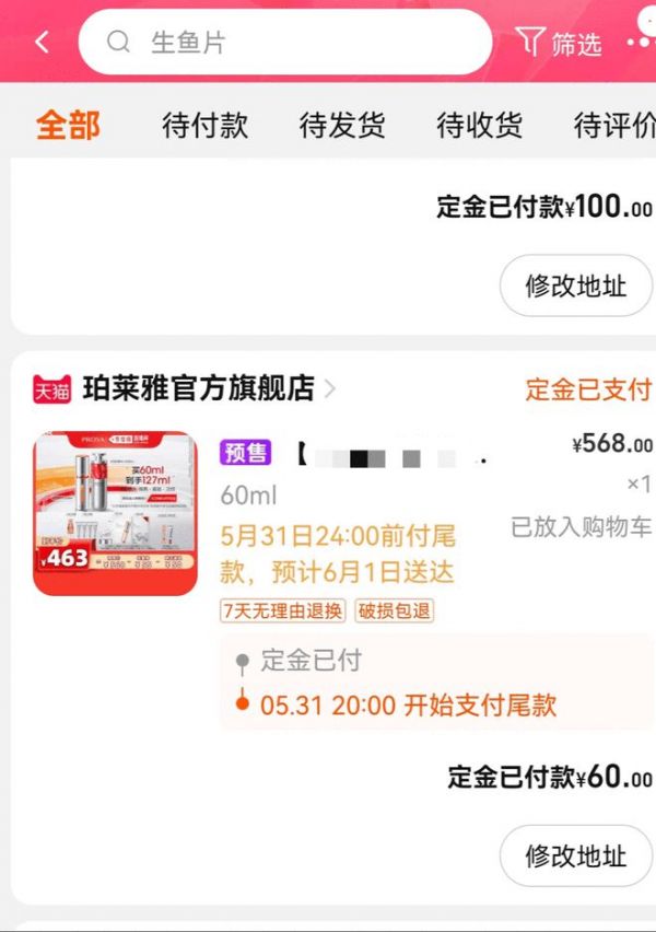 为进一步提升预售商品的送达时效,今年618,菜鸟、顺丰等物流服务商对天猫预售订单进行前置处理,在全国300多个城市提供“早上付款下午送到、睡前付款睡醒收货”的服务承诺。同时,天猫也分别通过“商品详情页物流时效表达、淘宝搜索标签”等形式,向消费者展示。