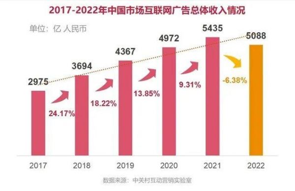 图源:中关村互动营销实验室中关村互动营销实验室披露的《2022中国互联网广告数据报告》显示,2022年,中国互联网广告市场规模为5088亿元,同比下跌6.38%,为七年来首次下滑。