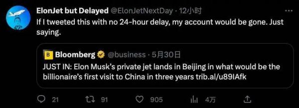 他建了个新的 Twitter 账号继续分享马斯克的私人飞机行踪,但信息得滞后 24 小时。