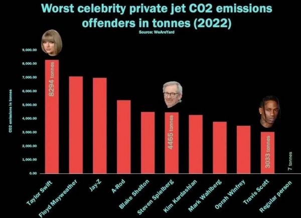 除了公司高管以外,Taylor Swift、Jay-Z、Steven Spielberg、Kim Kardashian、Kylie Jenner 等明星都曾因私人飞机碳排放问题遭公众批评。