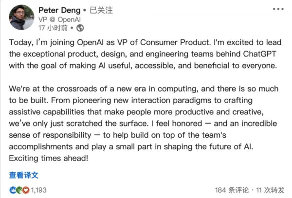他是经手过无数大 dau 产品的超级产品人,今天宣布加入了 OpenAI,职位是消费产品 VP。