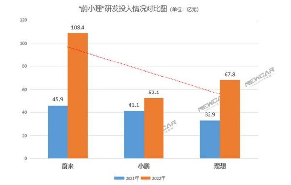 数据显示,蔚来、理想、小鹏三家车企在2022年的研发投入分别为108.4亿元、67.8亿元、52.1亿元。2023年,三家企业还将会进一步提升研发投入。