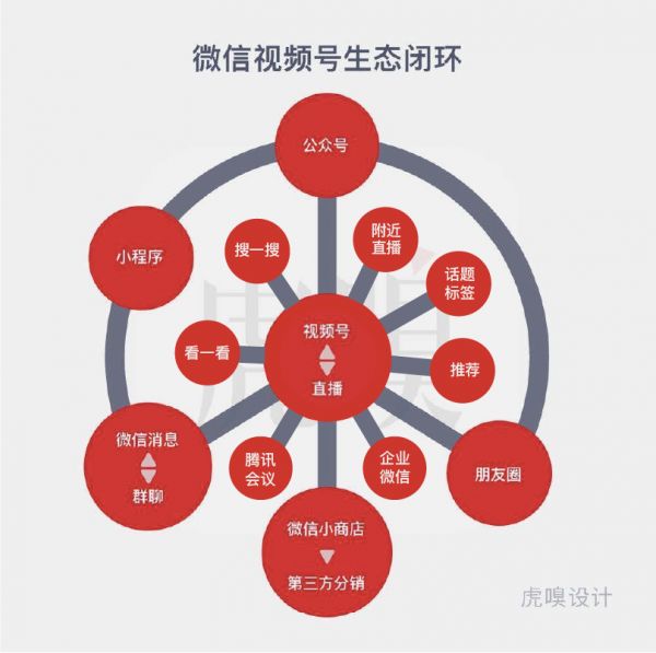 如今,微信生态接连向视频号开放多级流量入口,不仅打通了腾讯会议、企业微信场景,而且朋友圈、推荐、话题标签、搜一搜、看一看、公众号、附近直播均为视频号设置了入口,连私域端的关注、朋友、名片页、发现页、微信群、聊天对话框也可一键进入视频号。