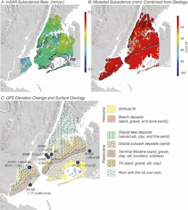 而纽约地面之下的情况非常复杂,它在一片冰川沉积物中,其中又包含几个不同的单元,包括黏土、砂土和湖泊沉积物、海岸沉积物以及露出地表的基岩等等。此外在海岸线附近还有大量人工填料区域,这些材料也是可压缩的。