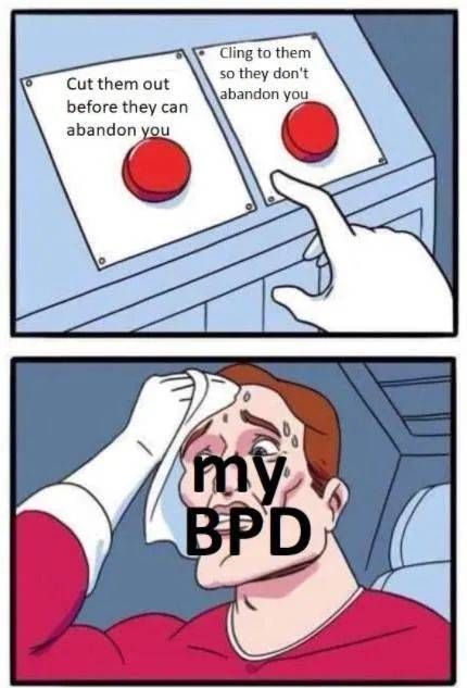 这种分裂源自 BPD 对被抛弃的恐惧[9],以至于他们竭力试图阻止别人离开他们,不管是对他人百般讨好、满怀感激,还是通过暴怒和武力来攻击他人,这其实都是BPD 阻止关系结束,或者缓解恐惧的方式。