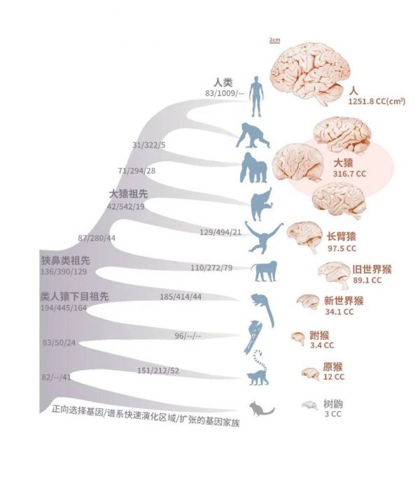 此外,研究人员还发现很多基因在不同的灵长类支系中发生了正向选择,并由此推测,这些基因在灵长类脑容量扩张的演化过程中起了重要作用,特别在那些伴随着皮层折叠和脑容量显著增加的关键演化节点上意义重大。