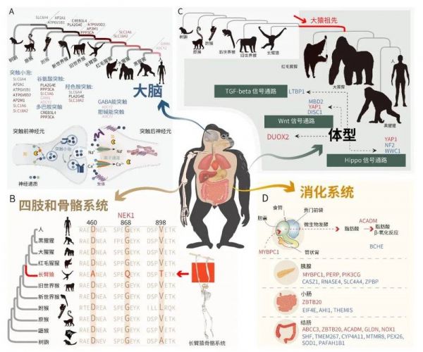 骨骼的变异是我们第一眼就能注意到的。不同的灵长类动物,体型差异巨大——鼠狐猴只有几十克,而大猩猩能超过200公斤。研究人员在大猿祖先的基因中发现了几个重要基因,推测它们可能影响了大猩猩体型的演化。其中一个是DUOX2基因,它参与了甲状腺激素的合成,这是一种对身体发育非常重要的激素。DUOX2基因变异能导致小鼠和熊猫的体型变小(见图5-a)。此外,还有一些基因参与了骨骼发育和体型大小的通路,比如TGF-beta、Wnt信号通路以及Hippo信号通路(见图5-c)。