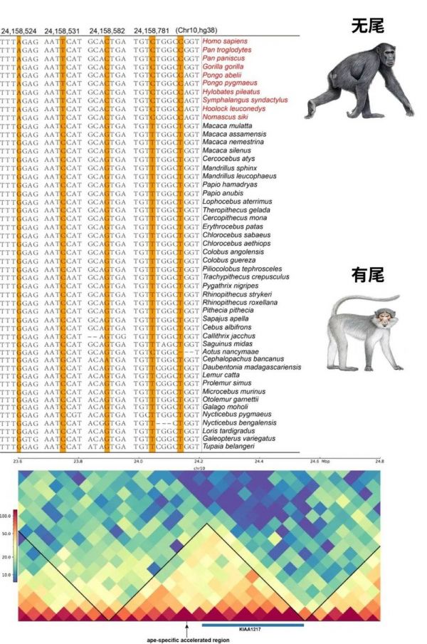 图4.KIAA1217基因的调控区域在猿类中快速演化,可能导致了猿丢失尾巴。在图形下方可以看到快速进化区域与基因落在同一个TAD(图上三角形)中,暖色表示较强的相互作用。(张国捷课题组和吴东东课题组合作供图)