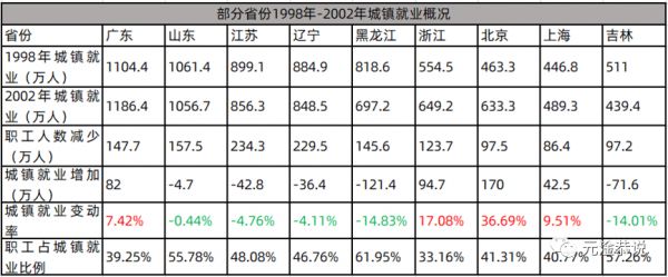 上表中的九个省份,国有、集体企业都出现了下岗潮。但广东、北京、上海、浙江四个省份的城镇就业人口数却不减反增。这意味着,在这些地方,外资企业、民营企业等非公经济企业新创造的岗位,完全填补了国企破产改制带来的岗位消失,还创造了新的就业增量。