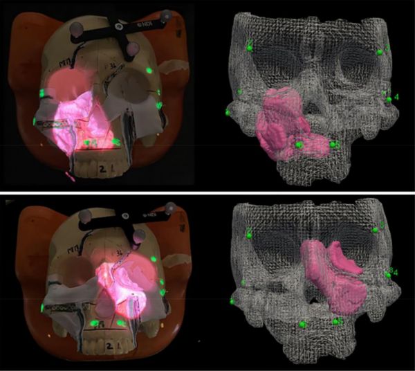 使用 AR 对不同类型的鼻腔鼻窦肿瘤进行投影,绿色的点用于位置对齐 |参考资料 [1]