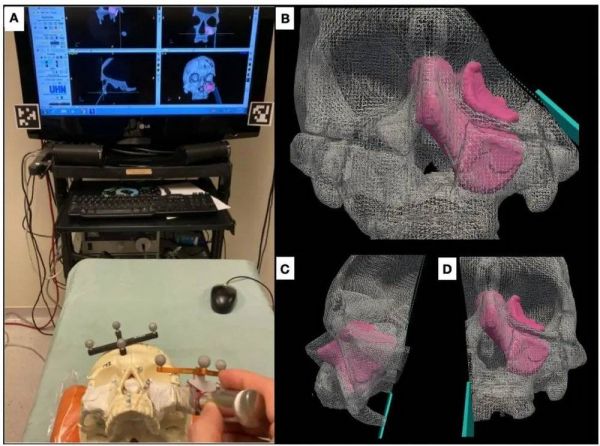 (A) 传统图像引导手术系统布局,(B) (C) (D) 由监视器显示的肿瘤三维重建模型|参考资料 [1]