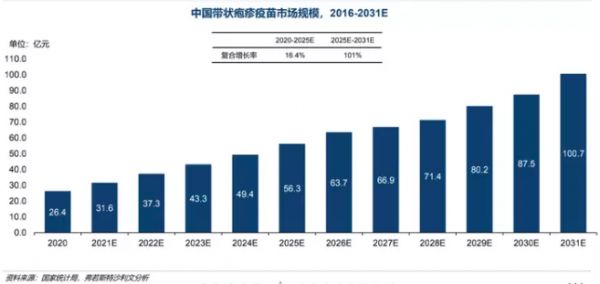 根据第三方研究机构弗若斯特沙利文的统计报告,到2022年,仅中国带状疱疹疫苗市场规模就有37.3亿元,到2025年这个规模将达到56.3亿元,到2031年将突破百亿元大关。