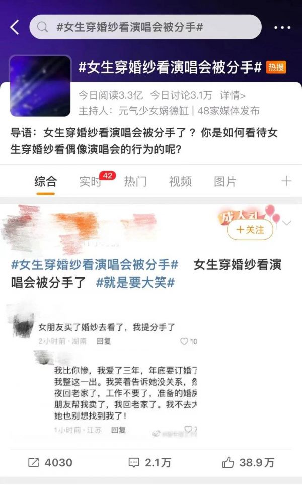 尤其是部分婚纱女孩的男友们,在他们眼中,女孩将为偶像穿上婚纱就意味着将爱平分了一份给偶像,甚至会怀疑自己在女孩心目中的位置。因此他们强调起婚纱的重要性,在社交平台上公开发布分手言论,只为了抚平内心的酸涩。