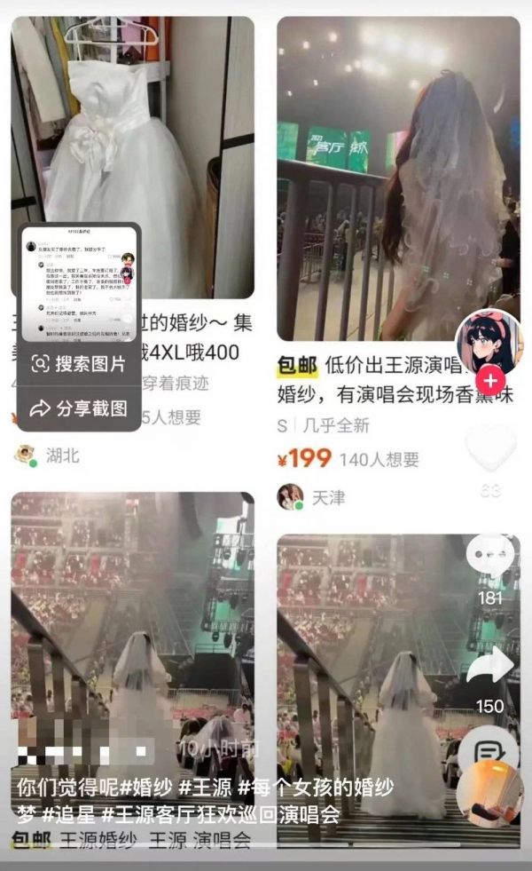 5月中旬,歌手王源的客厅狂欢巡演来到了广州站,演唱会间隙的talking环节,王源向歌迷们表示真诚感谢的同时,特意提到了人群中某位穿着婚纱的女孩。虽然他没有给予“婚纱”更多的评价,只流露了当下的惊讶和感动,现场的粉丝们依然爆发出羡慕的尖叫声,仿佛那一刻她们也希望自己是身披白纱、脱颖而出的那个,能够在偶像的印象中留下“惊鸿一瞥”。