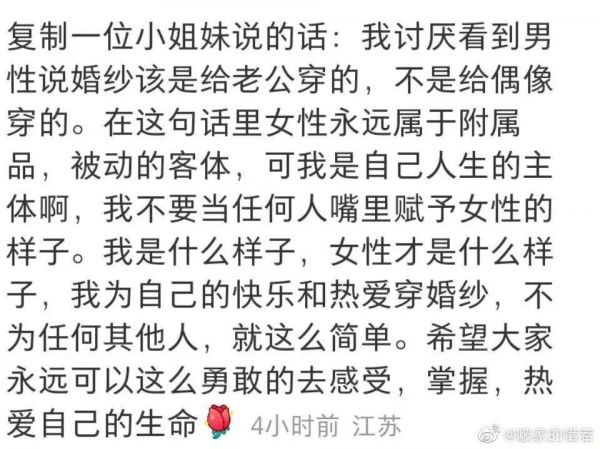 同样的,关于追星,如果无法接受这样的“感情杂质”横亘其间,或是不尊重彼此的底线,那这样的关系本就脆弱,无需惋惜;如果将对方的快乐看得比自己的私心更重,发自内心地尊重彼此,珍视爱情,“婚纱为谁而穿”更成为了无需纠结的话题。