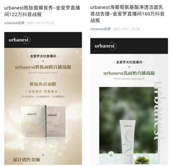其中,上海华韩恒佳化妆品有限公司旗下品牌为urbanest,目前并未在天猫开店,其抖音账号最后一条更新视频停留在2021年11月。其公众号发表的战报显示品牌面膜首秀曾在“金爱罗”直播间取得了销售额122万元的成绩,另一款洁面乳在“金爱罗”直播间销售额也达到160万元。