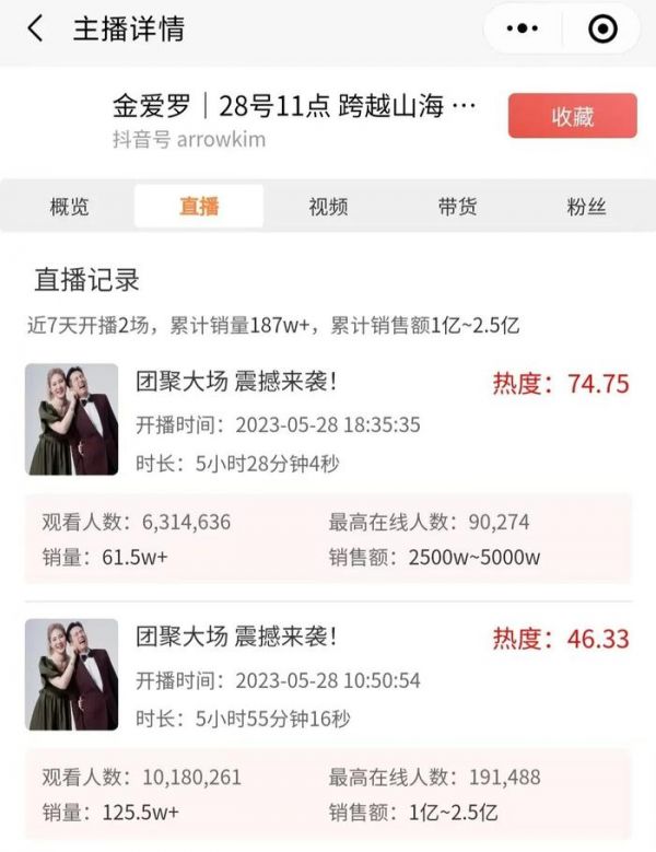 据了解,“金爱罗”开播2小时,直播间销量额已破亿。5月28日,“金爱罗”直播11.4小时,场观达到1650万人次,带货销售额累计2.17亿元。