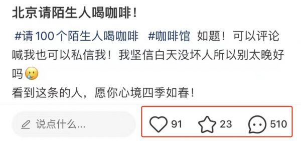 80后金融从业者Luvia,在某社交平台上发起了“请100个陌生人喝咖啡”的活动,理由不是为了打发时间,而是“以咖啡为载体产生有效的同频共振”。换句话说,就是了解不同行业的信息差。因为自己有所图,所以请客是应该的,“毕竟是求人办事儿,事办不办得成不重要,就当交个朋友。”