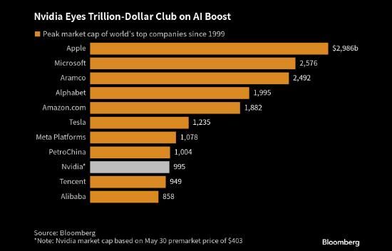 周二美股收盘,英伟达上涨4.3%,市值达到1.02万亿美元,加入了Alphabet Inc、亚马逊、苹果公司和微软这类公司所组成的万亿美元市值阵营。全球只有不到10家公司到过这一水平。