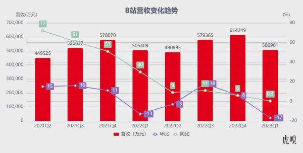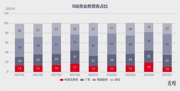 先说增值服务,2023Q1 季度 B 站增值服务业务收入达 21.6 亿,同比微增 5%——表面看,这是四大业务中稳健增长的一块;实际上,这也是 B 站的局限所在。