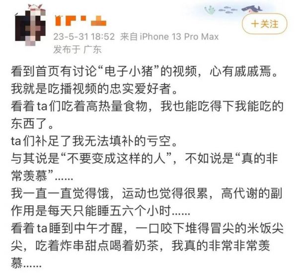 某“电子小猪”吃播视频的忠实爱好者发文称:“真的很羡慕她们一口咬下堆得冒尖的米饭,吃着炸串甜点喝着奶茶。”“电子小猪”补足了自己无法填补的亏空,成为了日常生活中不可或缺的陪伴。