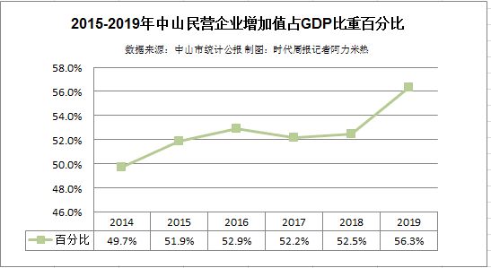 中山市统计局披露的数据显示,2015~2019年,全市民营经济增加值占全社会GDP的比重均超过50%。