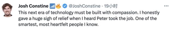 他接着说,“下一个技术时代必须是建立在具备同情心的基础之上的。当我听到Peter接任了这份工作时,老实讲我松了一大口气,他是我所认识的最聪明、最真诚的人之一。”