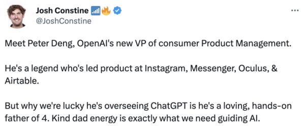 曾和Peter Deng有过接触的Josh Constine发推评价说,“他是主导过Instagram、Messenger、Oculus和Airtable等产品的传奇式人物。不过我们之所以认为由他来负责ChatGPT非常幸运,是因为他还是一个充满爱心的、亲力亲为的4岁孩子的父亲。善良的父亲的能量正是我们引导AI所需要的。”