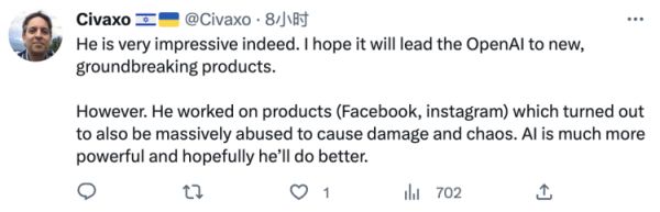 @Civaxo:他曾经开发过的产品(Facebook、instagram)最终都被大量滥用,造成了损害和混乱。人工智能更加强大,希望他能做得更好。