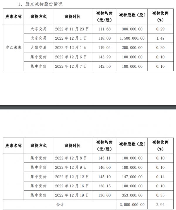 解禁后不久,2022年11月3日,*ST左江公告,左江未来拟减持股份不超过300万股,即不超过公司总股本的2.94%。截至2022年12月19日,本次减持计划实施完毕,减持价格区间为116.68元/股-146元/股,套现超3亿元。