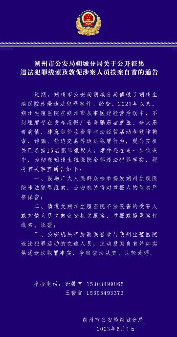 根据山西省朔州市公安局朔城分局发布的通告,2021年以来,朔州生殖医院在朔州市从事医疗经营活动时,就不同程度存在发布虚假广告诱骗患者就医、夸大患者病情、肆意加价收费等非法经营活动和敲诈勒索、诈骗、强迫交易等违法犯罪行为。
