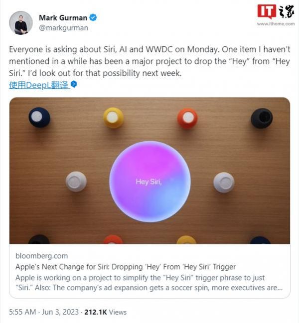 Gurman称苹果有望在WWDC23上宣布不再使用“嘿,Siri”唤醒词