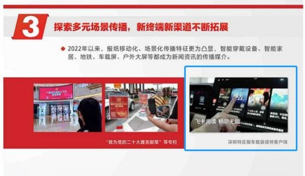 在“探索多元场景传播,新终端新渠道不断拓展”章节,报告称,2022年以来,媒体的移动化、场景化传播特征更为凸显。2022年,人民日报社等开设“我为党的二十大建言献策”专栏,运用公共场所户外大屏及公共交通移动电视进行全面推广,各平台征求意见页面总阅读量达6.6亿次。深圳特区报读特客户端推出的“手表版读特”和“车载版读特”,成功实现兼顾桌面电脑、手机、穿戴、车载等多场景的传播。