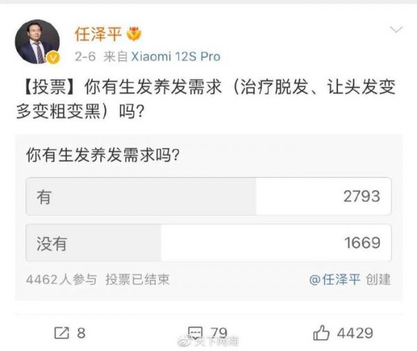 今年2月6日,任泽平在微博发起一组关于“你有生发养发需求”投票,共计4462人参与投票。