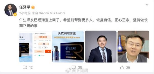 几天前,任泽平预告称,他与中科院合作的“仁生泽发”生发产品将于6月8日全网开售,并与7月15日在线下发售。消息一出,引发外界议论。