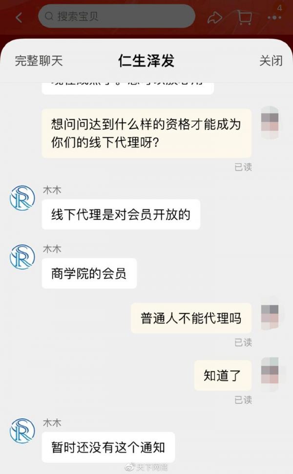6月1日晚间,《天下网商》咨询仁生泽发网店客服询问代理商门槛,其客服也表示目前线下代理仅对商学院会员开放,让有意向者先留下联系方式,很快,其客服便来添加意向者微信,称后期有通知或招募要求调整会第一时间拉群。