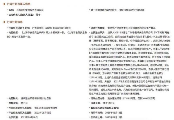 另外一家是上海艾恰餐饮服务有限公司,该公司被处罚的日期是2022年9月6日,处罚的原因是“食品生产经营者委托不符合要求的企业生产食品”,具体情况是上海艾恰餐饮服务有限公司在2021年8月曾与广州粤樾好食品有限公司签订委托加工合同,合同约定由广州粤樾好食品有限公司为其提供“木上缤菓”系列冰棒,实际订单共8万枝。这些冰棒最终作为原料,用于制作浮冰系列咖啡产品,但问题的关键是,广州粤樾好食品有限公司未取得食品生产许可。最终上海艾恰餐饮服务有限公司被没收违法所得12.71162万元,罚款36万元。