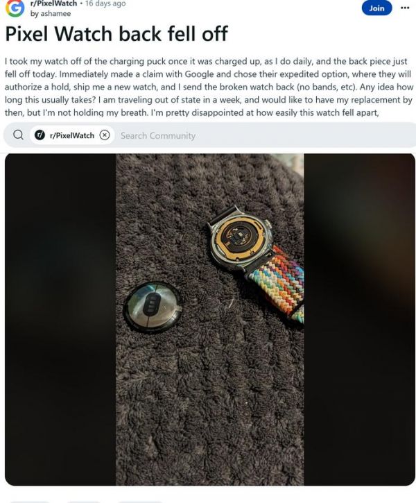 继使用 1 天即烧屏后,Pixel Watch 用户再反馈后盖脱落问题