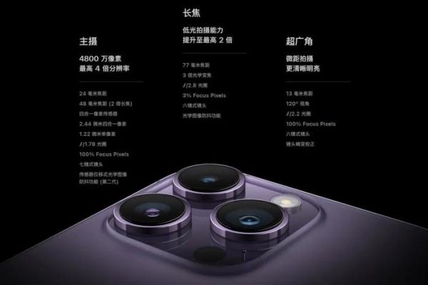 后置三摄,分别是4800万像素主镜头,支持位移防抖,1200万像素超广角镜头,1200万长焦镜头,支持光学防抖,以及LiDAR激光雷达扫描仪。前置1200万像素摄像头,支持灵动岛技术。