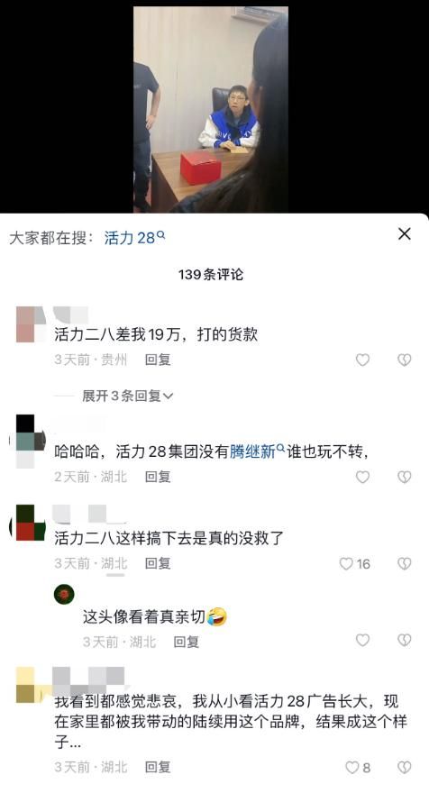 “应该是资金链断了”某行业内人士称“其实都有苗头的,今年5月份荆州做了一场活动,请了很多明星。作为明星企业通常会冠名的,而活力28却缺席了。那时就传出来资金链断裂“。