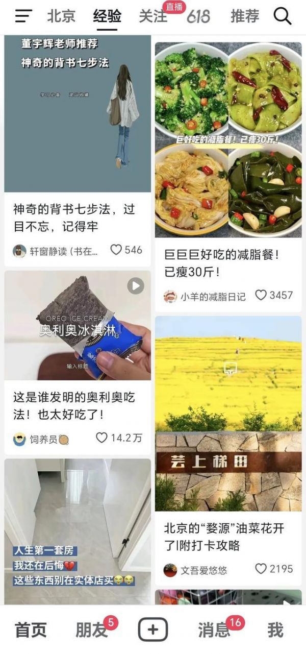 2023年5月下旬,抖音APP在首页上线“经验”专区,入口在首页顶Tab,以双列瀑布流形态展示用户的图文和视频笔记,产品形态接近小红书。