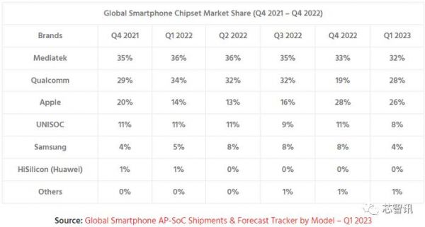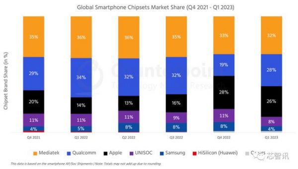 三星排名第五,一季度市场份额为4%,同比下滑了1个百分点,环比则大幅下滑了4个百分点。而这主要是由于三星S23系列旗舰机型全面采用了高通骁龙处理器。