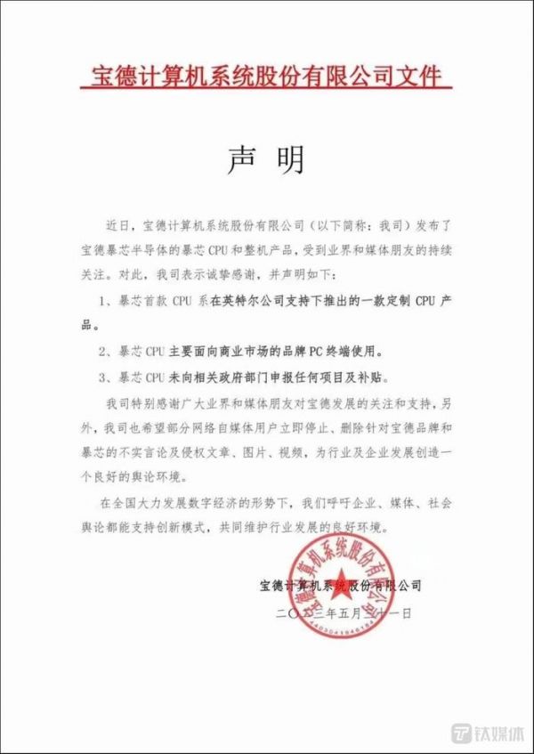 在各种舆论纷扰和压力之下,5月31日晚,宝德计算发布声明,承认暴芯首款CPU系在英特尔公司支持下推出的一款定制CPU产品,主要面向商业市场的品牌PC终端使用。声明特意强调,未向相关政府部门申报任何项目及补贴。