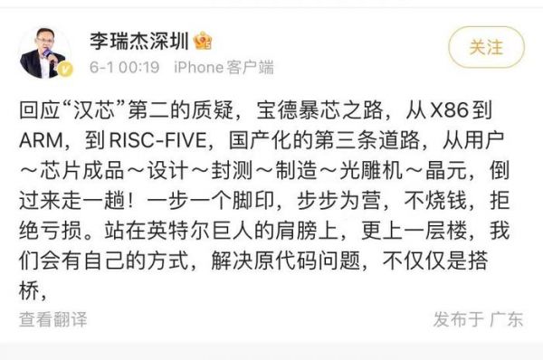 6月1日凌晨,李瑞杰在微博上回应“汉芯第二”的质疑称,宝德暴芯要走国产化的第三条道路。“一步一个脚印,步步为营,不烧钱,拒绝亏损。站在英特尔巨人的肩膀上,更上一层楼,我们会有自己的方式,解决原代码问题,”李瑞杰称,争取通过宝德暴龙控制源码,杜绝芯片后门攻击。”