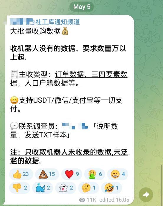 数据如甘蔗,经过“商业组织”的咀嚼后,原本颜色鲜亮的甘蔗已经干涩了,当被人拿到黑市二次或者多次流通后,就只剩下干燥的浆状纤维,这时才会流通到社工库。