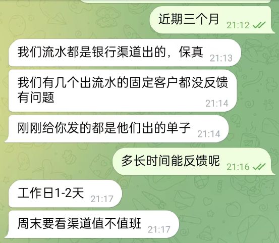 我有些担心再次被骗,这可不是一笔小数字。不过客服再三保证,四大行四小行流水均可查询,都是内部人员从系统导出的表格,绝对真实可靠。他给出的证据是“我们有几个出流水的固定客户从没反馈过有任何问题。”