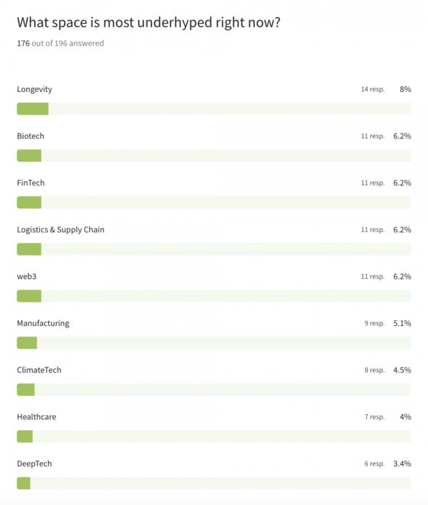在近期发布的2023Q1新兴VC基金管理人调查报告中,91/185位基金管理人将AI & ML(机器学习)列为当前泡沫最大的投资方向。